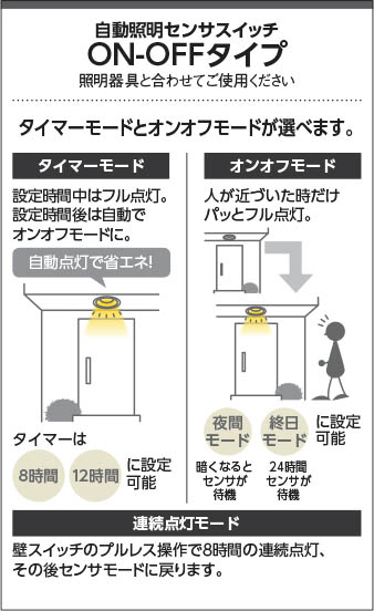 | 補足・注意事項 | ◆設定時間可変型(10秒・1分・3分・10分) ◆照度センサ付 ◆グラスウール敷施工・ブローイング可能型 ◆2A(200VA)まで ◆点灯照度スイッチ「切」で昼間でも動作確認が行えます ◆センサ付・自動点滅器付器具との接続不可 |