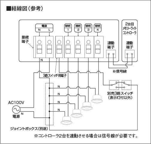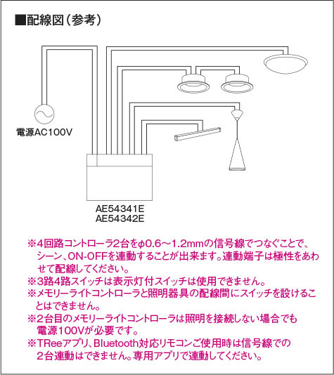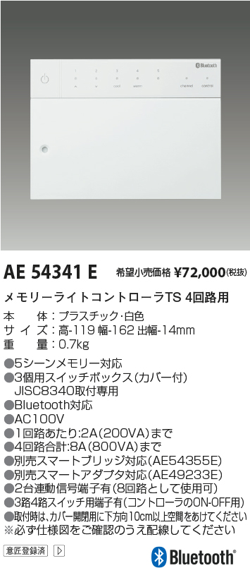 | 補足・注意事項 | ◆5シーンメモリー対応 ◆3個用スイッチボックス(カバー付)JISC8340取付専用 ◆AC100V ◆1回路あたり:2A(200VA)まで ◆4回路合計:8A(800VA)まで ◆別売スマートブリッジ対応(AE54355E) ◆別売スマートアダプタ対応(AE49233E) ◆2台連動信号端子有(8回路として使用可) ◆3路4路スイッチ用端子有(コントローラのON-OFF用) ◆取付時は、カバー開閉用に下方向10cm以上空間をあけてください ※必ず仕様図をご確認のうえ配線してください |