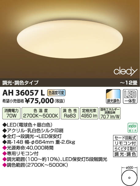 | 補足・注意事項 | ◆消費電力:70.0W ◆色温度:2700K ◆演色性:Ra83 ◆光源寿命:40,000時間 ◆専用リモコン付 ◆調光範囲(100~約10%)、LED保安灯5段階調光 ◆調色範囲(2700K~5000K) |