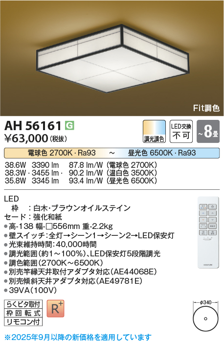 | 補足・注意事項 | ◆消費電力:38.3W ◆光束値:3455lm ◆39VA(100V) ◆色温度:2700K~6500K ◆演色性:Ra93 ◆光束維持時間:40,000時間 ◆調光範囲約1~100%、LED保安灯5段階調光 ◆調色範囲(2700K~6500K) ◆別売竿縁天井取付アダプタ対応(AE44068E) ◆別売傾斜天井アダプタ対応(AE49781E) ※上記の数値は、3500K時の値です |