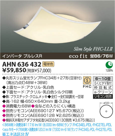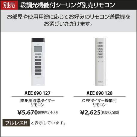 | 補足・注意事項 | ◆消費電力:68.0W ◆虫などの入りにくい構造 ◆別売リモコン〔AEE690127 \5,670(税込)〕 ◆別売リモコン〔AEE690128 \2,625(税込)〕 ◆傾斜天井取付アダプタ対応型〔AEE690130別売 \3,675(税込)〕 |