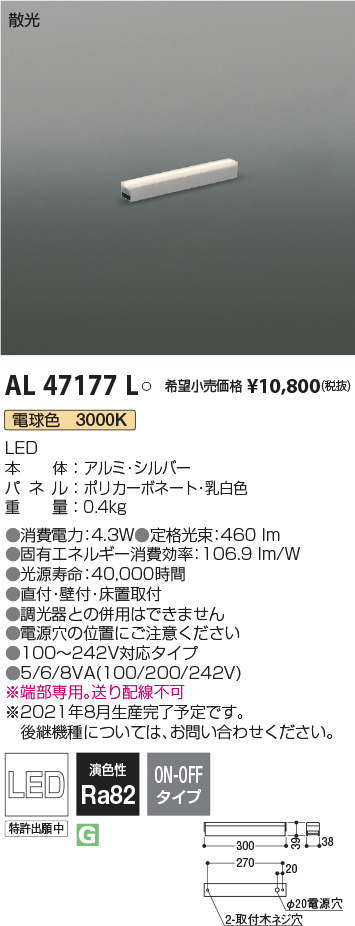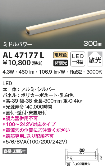 | 補足・注意事項 | ◆消費電力:4.3W ◆色温度:3000K ◆演色性:Ra82 ◆光源寿命:40,000時間 ◆直付・壁付・床置取付 ◆調光器との併用はできません ◆電源穴の位置にご注意ください ◆100~242V対応タイプ ※端部専用。送り配線不可 |
