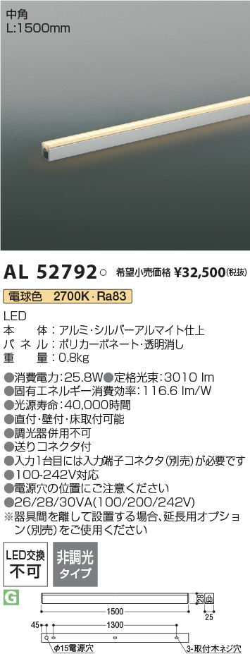 | 補足・注意事項 | ◆消費電力:25.8W ◆光束値:3010lm ◆26/28/30VA(100/200/242V) ◆色温度:2700K ◆演色性:Ra83 ◆光源寿命:40,000時間 ◆調光器併用不可 ◆入力1台目には入力端子コネクタ(別売)が必要です ◆電源穴の位置にご注意ください ◆送りコネクタ付 ※器具間を離して設置する場合、延長用オプション(別売)をご使用ください |