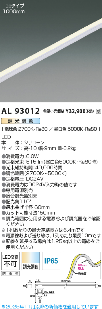 | 補足・注意事項 | ◆消費電力:6.0W ◆光束値:515lm ◆色温度:2700K~5000K ◆演色性:Ra80 ◆光束維持時間:40,000時間 ◆調光範囲約1~100% ◆調色範囲(2700K~5000K) ◆定格電圧:DC24V ◆消費電力はDC24V入力時の値です ◆配光角110° ◆最小曲げ半径 60mm ◆カット可能寸法:50mm ◆専用電源別売 ◆適合調光器別売 ※調光範囲は使用する電源および調光器をご確認ください ※1列あたりの最大連結長さは6.4mです ※電源線および送り線は、1列あたり最長10mです ※配線を延長する場合は1.25sq以上の電線をご使用ください ※上記の数値は、5000K時の値です |