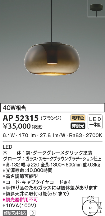 | 補足・注意事項 | ◆消費電力:6.1W ◆光束値:170lm ◆10VA(100V) ◆色温度:2700K ◆演色性:Ra83 ◆光源寿命:40,000時間 ◆高さ調節可能型 ◆コード・キャブタイヤコードφ4 ◆手作り品のためガラスには個体差があります ◆調光器併用不可 |