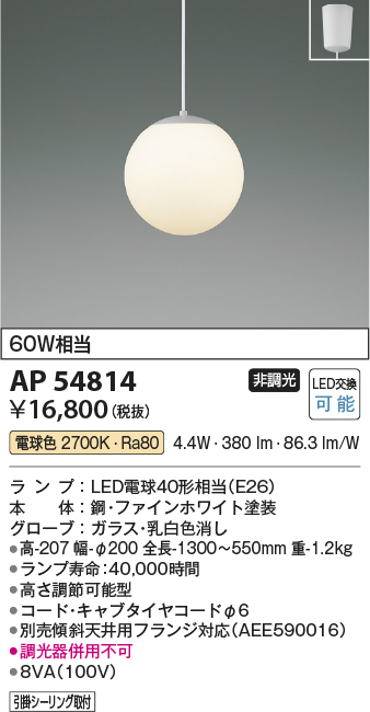 | 補足・注意事項 | ◆消費電力:4.4W ◆光束値:380lm ◆8VA(100V) ◆色温度:2700K ◆演色性:Ra80 ◆ランプ寿命:40,000時間 ◆高さ調節可能型 ◆コード・キャブタイヤコードφ6 ◆別売傾斜天井用フランジ対応(AEE590016) ◆調光器併用不可 |