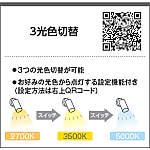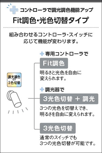 | 補足・注意事項 | ◆消費電力:8.1W ◆光束値:655lm ◆9VA(100V) ◆色温度:2700K|3500K|5000K ◆演色性:Ra82 ◆光束維持時間:40,000時間 ◆調光範囲・調色範囲・光色切替 Fit調色別売専用調光器:調光範囲(約3~100%)・調色範囲(2700K~5000K) 別売適合調光器:調光範囲(約1~100%)・光色切替(2700K→3500K→5000K) 壁スイッチ:光色切替(2700K→3500K→5000K) ◆照射近接限度10cm ◆調光調色、調光には別売調光器が必要です ※上記の数値は、2700K時の値です |