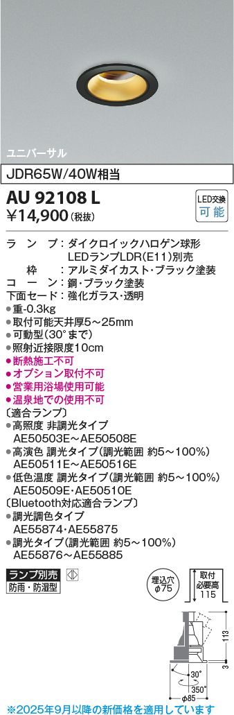 | 補足・注意事項 | ◆取付可能天井厚5~25mm ◆照射近接限度10cm ◆可動型(30°まで) ◆[適合ランプ] 高照度 非調光タイプ AE50503E~AE50508E 高演色 調光タイプ(調光範囲約5~100%)AE50511E~AE50516E 低色温度 調光タイプ(調光範囲約5~100%)AE50509E・AE50510E [Bluetooth対応適合ランプ] 調光調色タイプ AE55874・AE55875 調光タイプ(調光範囲約5~100%)AE55876~AE55885 ◆オプション取付不可 ◆営業用浴場使用可能 ◆温泉地での使用不可 |